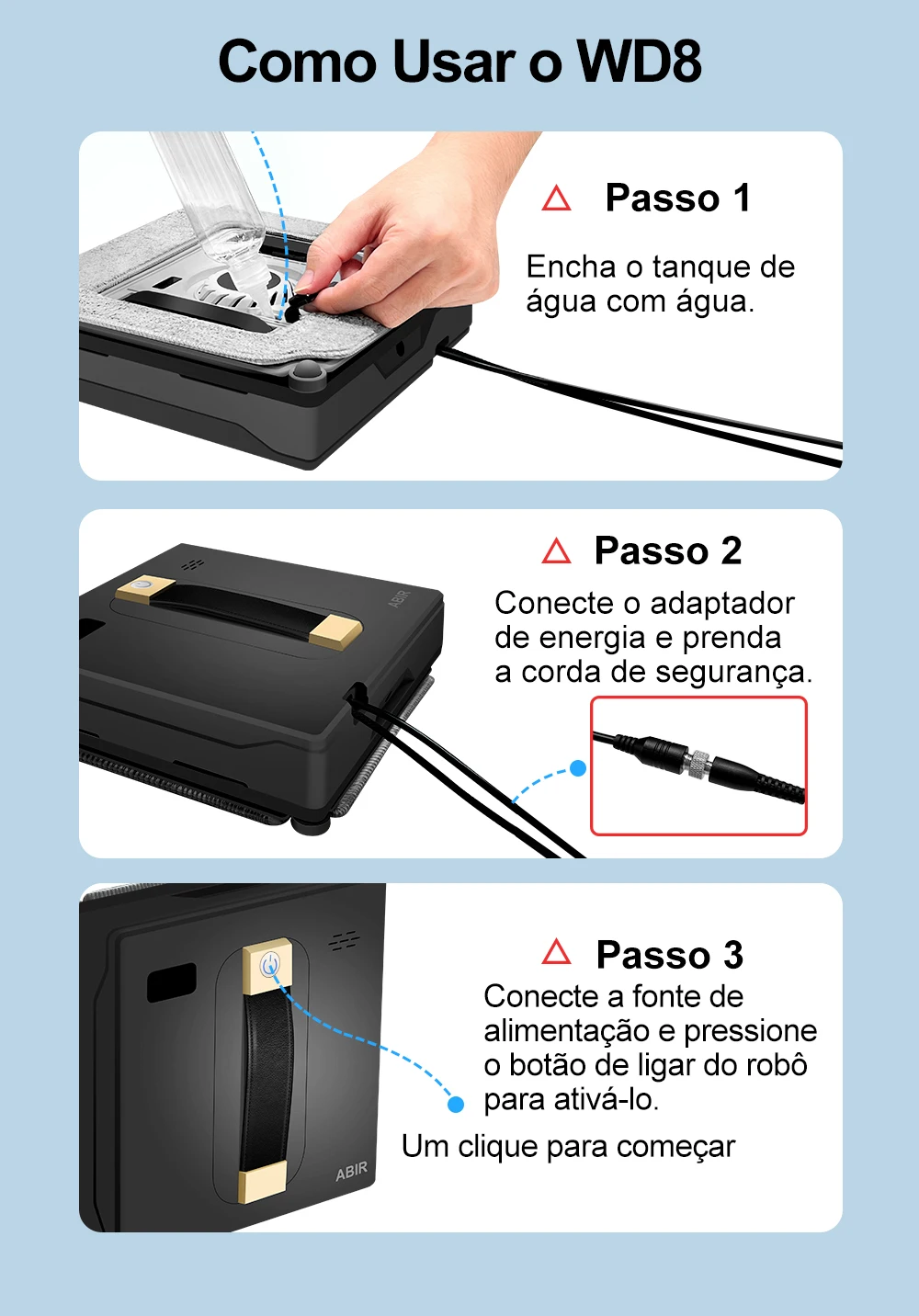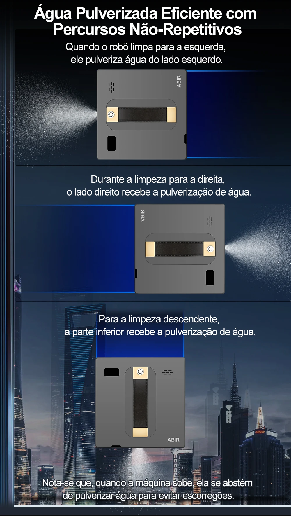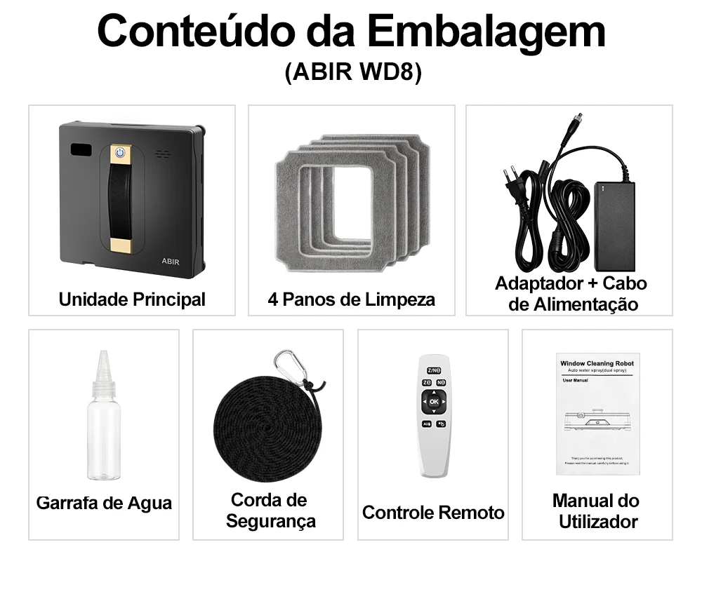 Cabo de segurança de 4 metros e bateria de segurança de 650 mAh para proteção ideal em caso de falhas de energia. 40 minutos para manter o robô na janela quando baixa potência.Carga-rolamento Vertical até 7kgs, que asseguram o robô trabalha bem fora,
