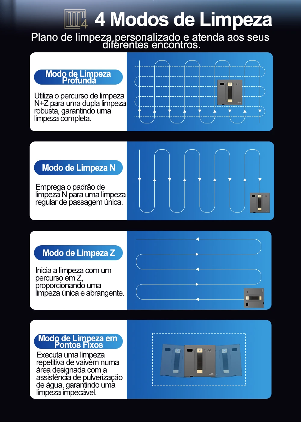 4 planeamento inteligente de rotas. Limpeza da rota "Z", limpeza da rota "N", limpeza da rota "N+Z", interruptor de limpeza de ponto fixo à vontade . Plano de limpeza personalizado e atender às suas diferentes reuniões.