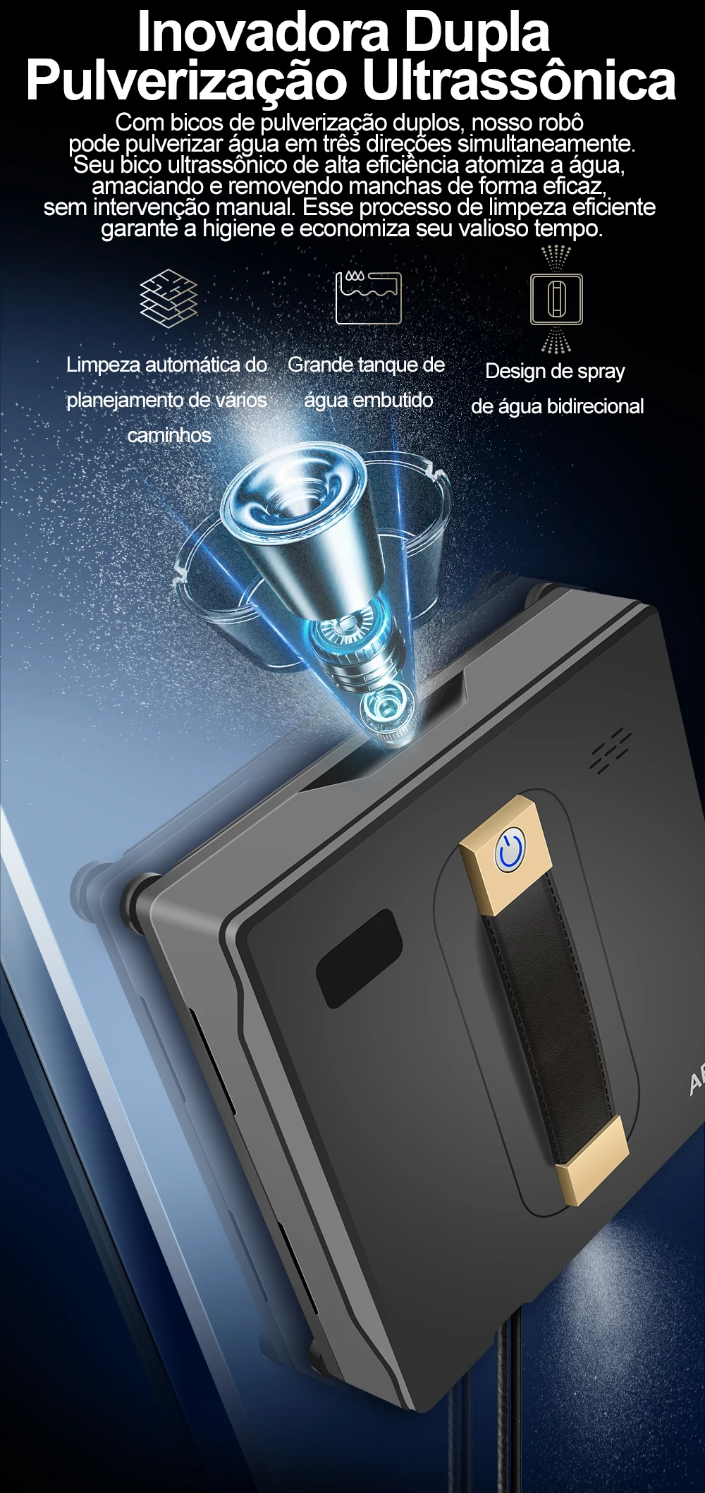A área da limpeza é melhorada por 90%, o bocal ultrassônico de grande eficacia atomiza a água, amacia fortemente e limpa manchas sem intervenção manual, limpa eficientemente e ganha o tempo!